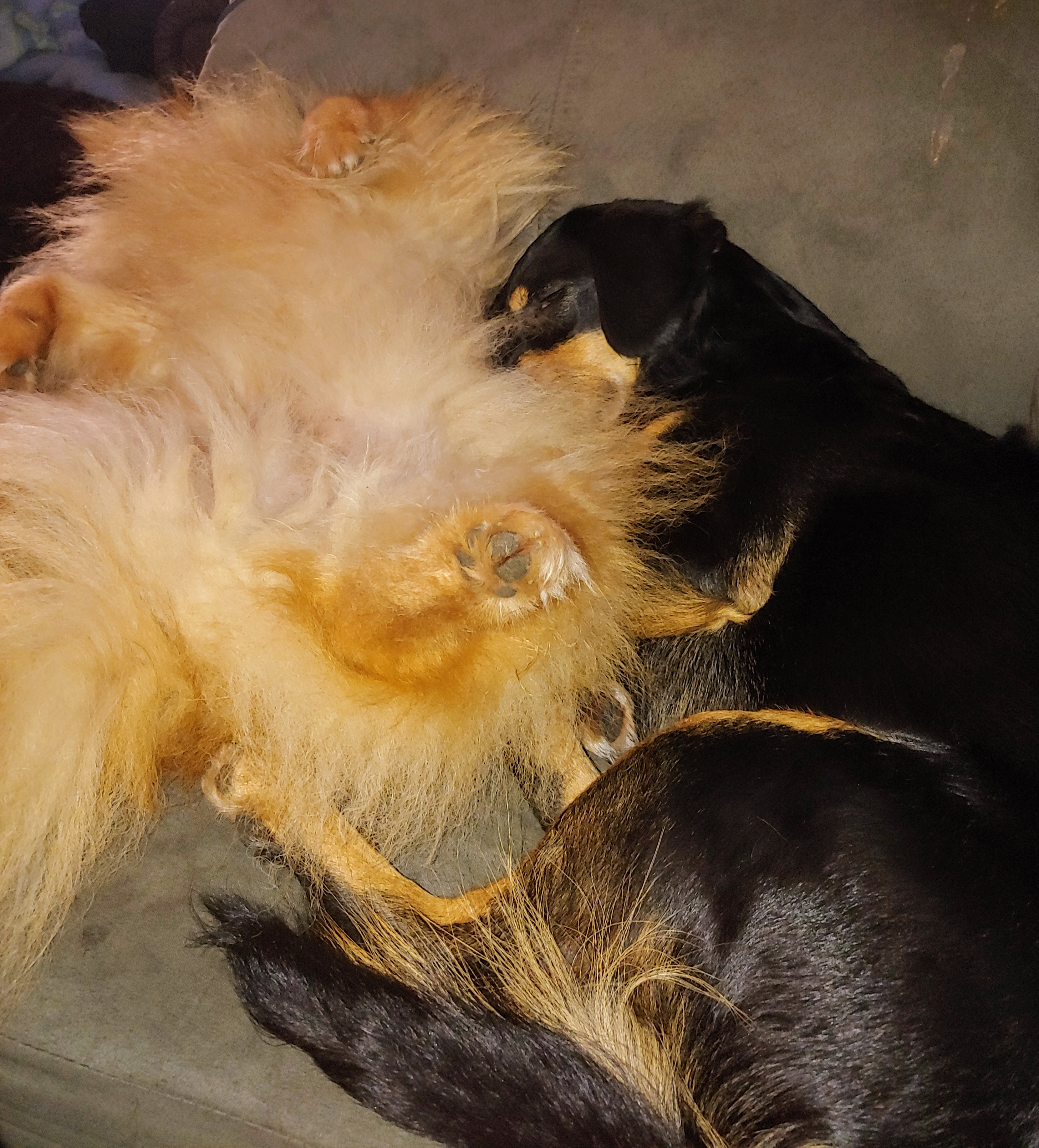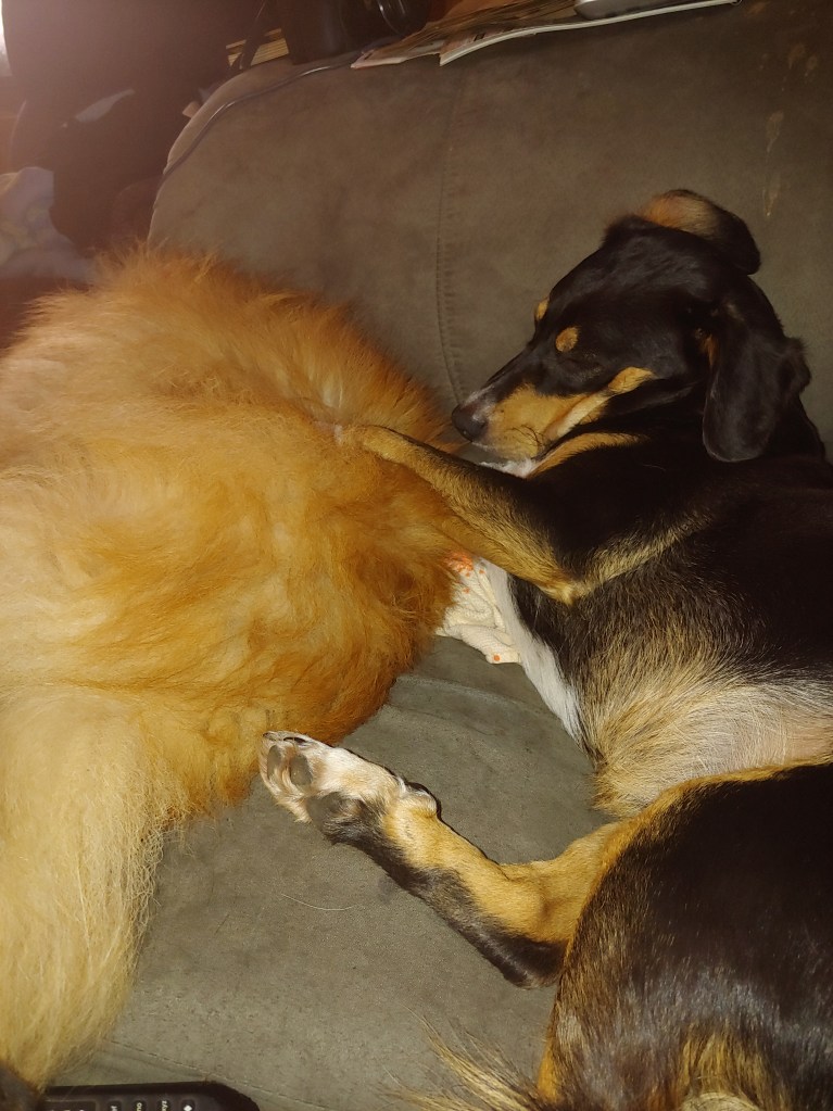 The fluffy one is Teddy, a pomeranian. The black dog is Spot, a “West Virginia black dog”. In other words, mutt.