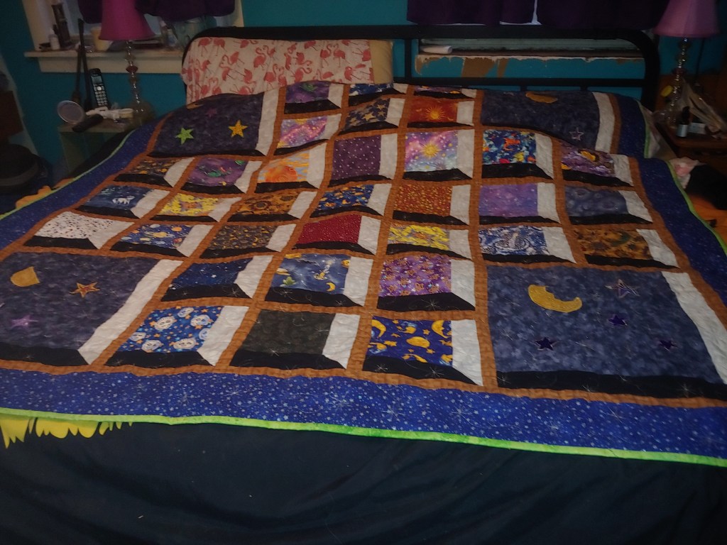 It is back from the quilter. I can’t believe how the quilter honored my struggle by doing the beautiful silver stars all over it. I’m going to bed and snuggle under it with my dogs. Progress and freedom.